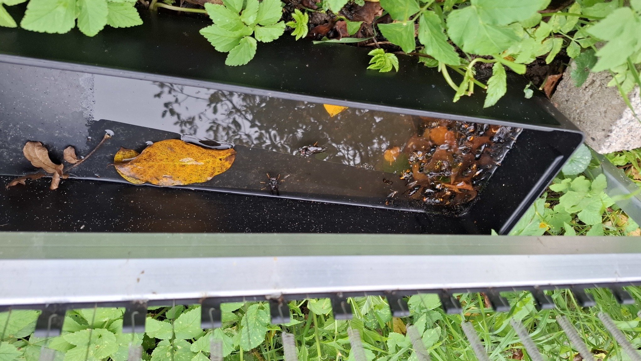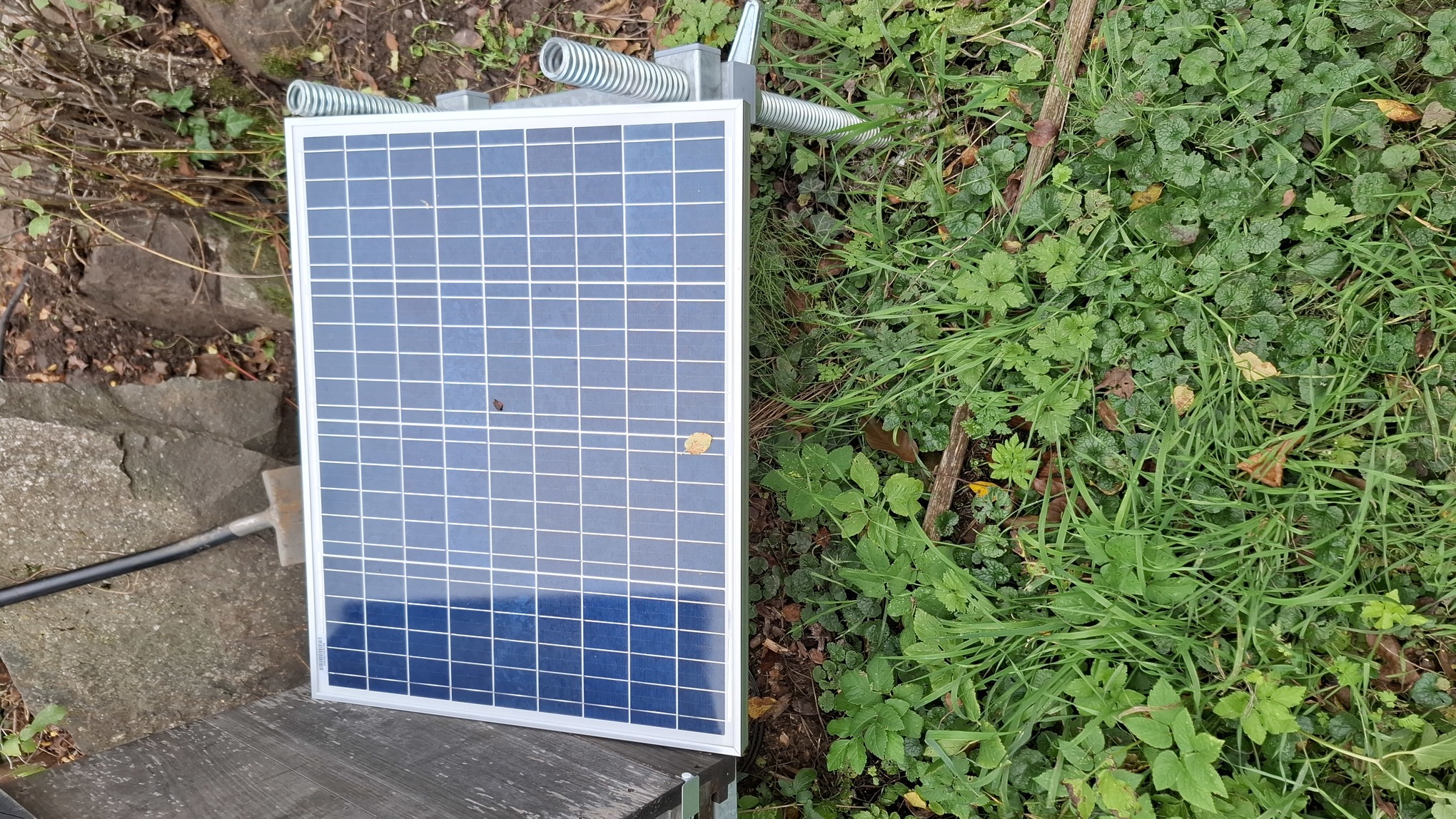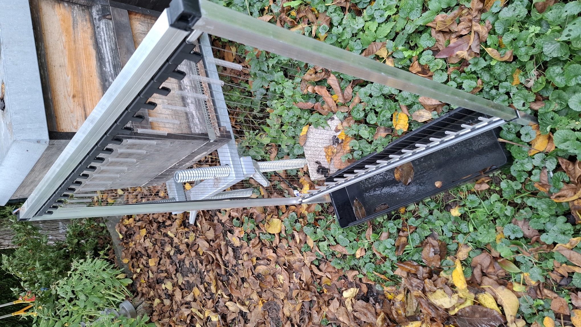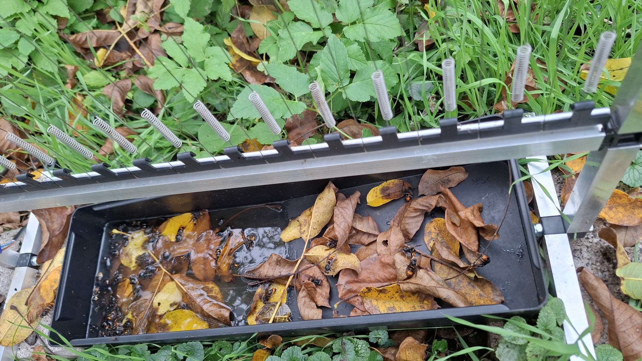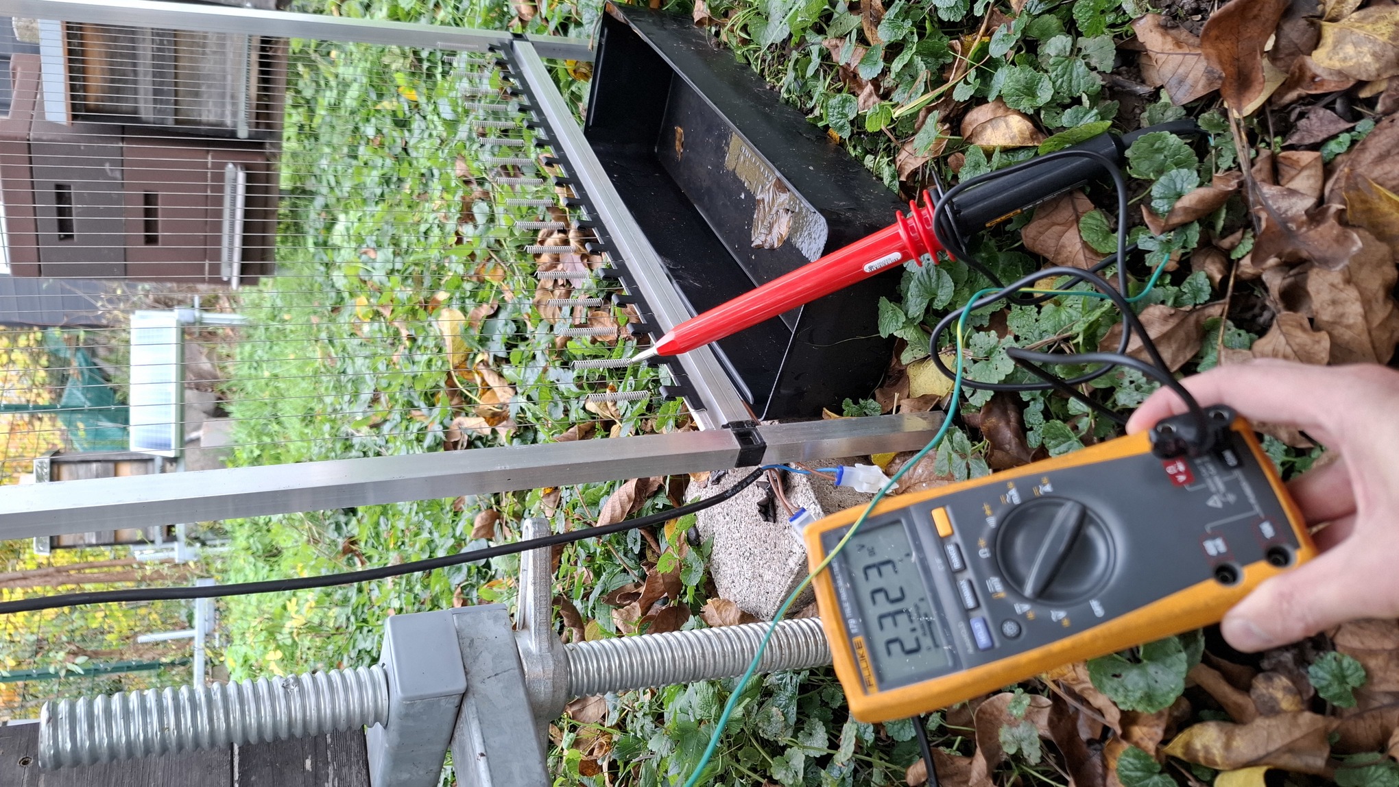 Achtung: Fallen sind derzeit (Stand 10/2025) in Deutschland verboten - keine 10km weiter in Frankreich aber erlaubt. Es gibt keine 100% selektive Falle wie vom Gesetzgeber gefordert. Man muss aber davon ausgehen, dass in den kommenden Jahren eine Imkerei in Deutschland nicht mehr ohne Fallen möglich ist - wie sich bereits in Frankreich und Spanien gezeigt hat. Im Grunde gibt es 2 Arten von Fallen: solche die chemisch (mit Lockmitteln) arbeiten und wiederum rein physikalische (mittels Strom). Am vielversprechensten sind die physikalischen Fallen ("Harfen"), da diese gemäß Studien [Denis Theiery et al, Okt. 2023, externer Link] eine sehr hohe Selektivität besitzen. Hierbei ist zwischen 2 Harfentypen zu unterscheiden: spanische Variante (üblicherweise 1800-2400V DC) französische Variante (4000-8000V DC). Die französische Variante ist meist darauf ausgelegt, die Insekten sofort zu töten, daher gehen wir hier nur auf die spanische Version ein. Die Grundfunktion ist einfach: es wird Strom durch die Drähte der Harfe geleitet. Berührt ein Insekt 2 Drähte gleichzeitig (Abstand meist 20mm), bekommt es einen Schlag und fällt zu Boden. Das Insekt wird sich i.d.R. binnen 5-10 Minuten erholen und wieder weiterfliegen und den Standort künftig meiden. Alternativ kann man die Falle mittels eines länglichen Gefäßes unter selbiger umbauen, so dass die Insekten in diese hineinfallen. Ist das Gefäß zudem mit Wasser (und einem Tropfen Spülmittel) gefüllt, gibt es für die Insekten kein Entkommen mehr. Üblicherweise ist die Energie die die Harfen als Stromschlag abgeben unter einem Joule, also deutlich geringer als z.B. die Energie eines Weidezaungenerators für Pferde (dies kann aber von Gerät zu Gerät variieren und sollte in der Anleitung/Datenblatt geprüft werden). Die hier durchgeführte Spannungsmessung wurde mit einem Hochvolt-Tastkopf (1:1000) durchgeführt. Die angezeigte Spannung ist also mit 1000 zu multiplizieren, was dann 2323V ergibt.