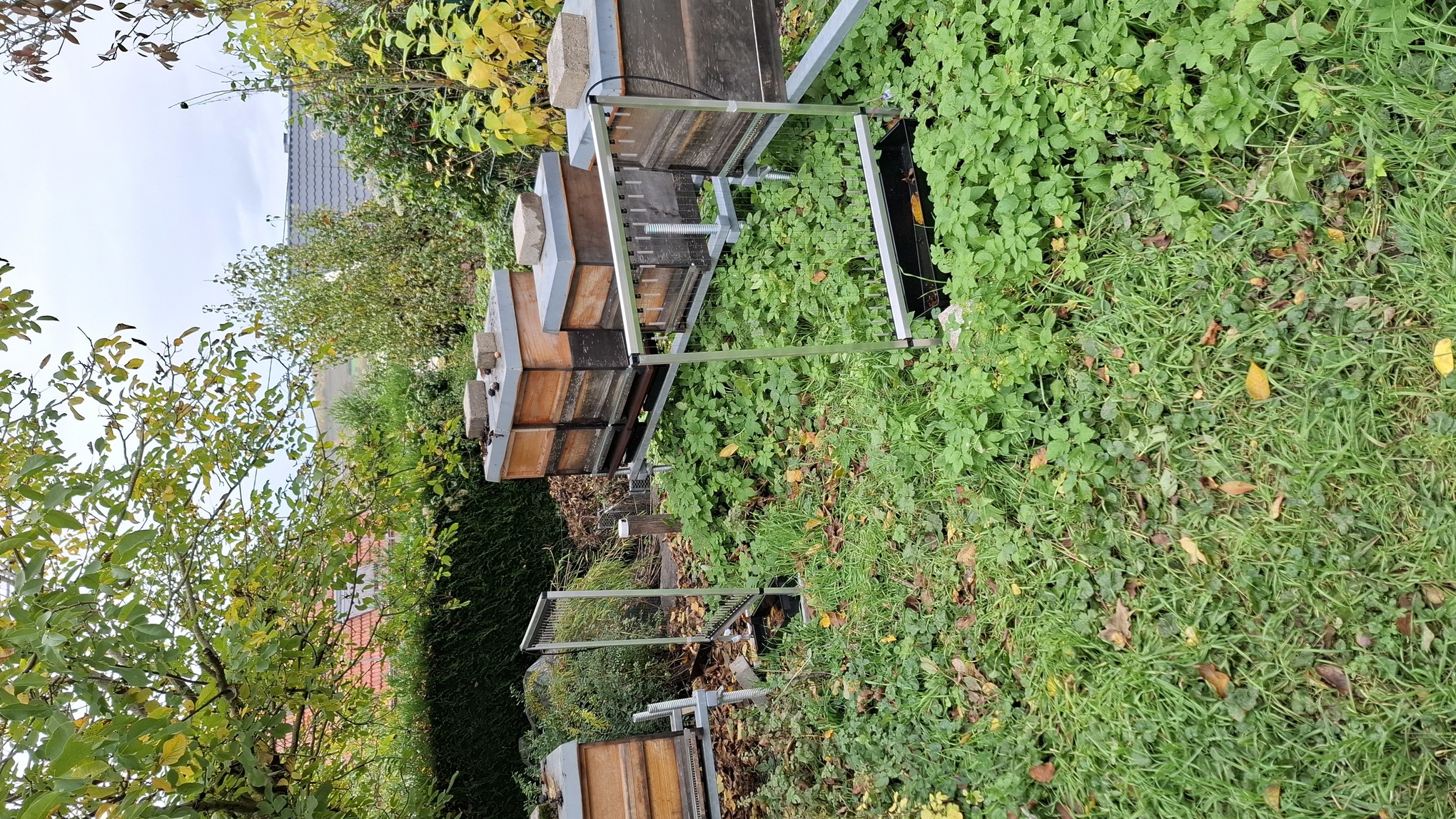 Ab ca. Mitte August sollten an den Beuten Schutzmaßnahmen gegen die Vespa Velutina durchgeführt werden. Hierzu dienen in erster Linien sogenannte "Maulkörbe" mit einer Maschenweite von 12-20mm. Diese sollen nicht den Einflug der Velutina verhindern sondern dienen als eine Art "demilitarisierte Zone". Die Bienen sind (wie ein Flugzeug auch) beim Starten und Landen am langsamsten - der Moment wenn die Velutina zuschlägt. Durch den Maulkorb wird die Sicht der Velutina behindert, wodurch die Bienen besser vor Zugriff geschützt sind und der Jagderfolg abnimmt. Die Bienen benötigen meist ein paar Tage um sich an die neue Gegebenheit anzupassen, danach kommen sie sehr gut damit zurecht. Der Maulkorb reduziert die gefürchtete Flugparalyse deutlich (Bienen fliegen nicht mehr aus, sobald 2-3 Velutina vor den Beuten fliegen und auf Beute lauern - dies führt u.a. zum Verkoten der Beute und dem leisen Niedergang des Volkes im Winter durch Viren und Bakterien). Weiterhin ist es ebenfalls ab Mitte August empfohlen Fluglochschieber mit einer Maschenweite von <5.3mm einzusetzen, damit bei niedrigen Temperaturen keine Velutina in die Beute eindringen kann (die Bienen ziehen sich in die Traube zurück und geben die Wachposten am Eingang bei kalten Temperaturen auf - dies ist für die Velutina ein Startsignal). Diese defensiven Maßnahmen reichen alleine aber nicht aus - es muss eine Suche nach dem/den Nester(n) durchgeführt werden um den Druck signifikant zu reduzieren.