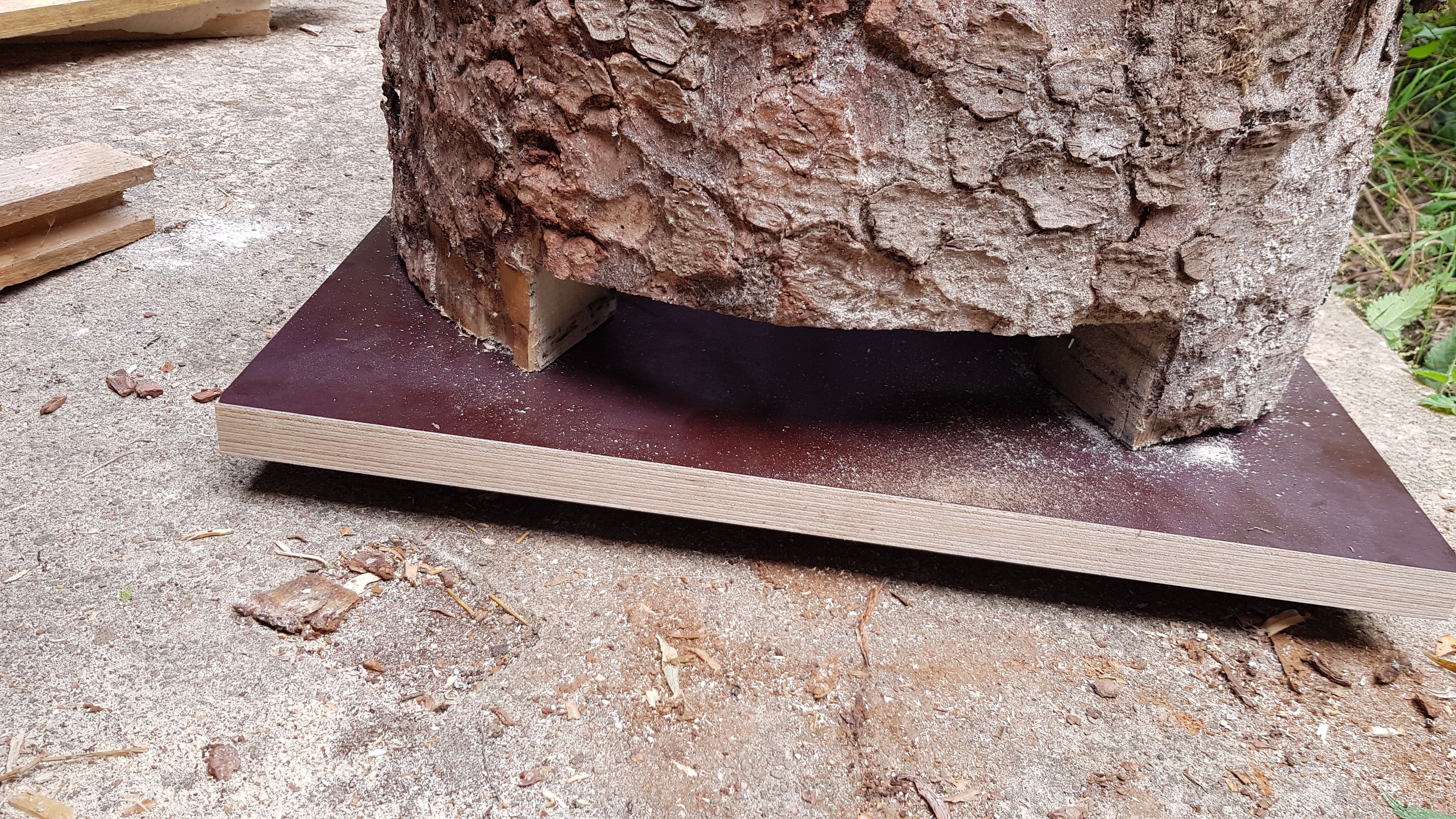 Die Klotzbeute wurde so bearbeitet, dass es möglich ist, im oberen Teil 5 kleine Rähmchen zur Honiggewinnung unterzubringen. Weiterhin ist durch diese Anpassung auch eine Behandlung gegen Varroa möglich. Im Fuße der Klotzbeute wurde eine "Revisionsöffnung" geschaffen um evtl. Unrat zu entfernen.