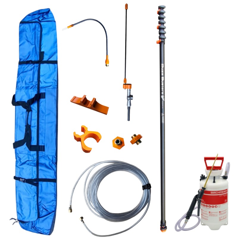 Um Nester - insbesondere Sekundärnester - in Höhe bekämpfen zu können ist eine Teleskoplanze notwendig. Am Markt gibt es hierzu mittlerweile einige Anbieter, unser Favorit hier ist die "High-Mod" Version der Lanze von "Buzzbusters" aus Frankreich. Im Bild abgebildet: Kit zur Bekämpfung, bestehend aus: