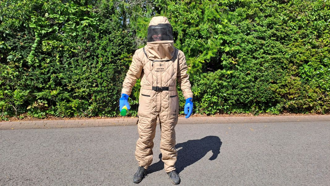 Da die asiatische Hornisse über eine Stachellänge von 6mm verfügt, sind normale Imkeranzüge unzureichend. Es ist zwingend ein spezieller Schutzanzug (hier z.B. Marke Xorsa© oder mittlerweile günstiger & besser: "Supron1 Hornet-2") nötig.